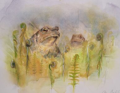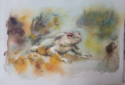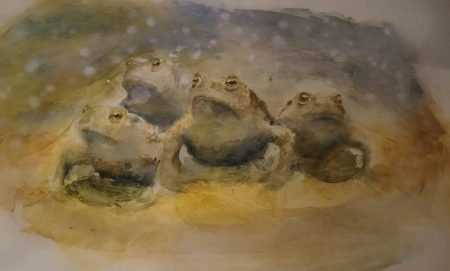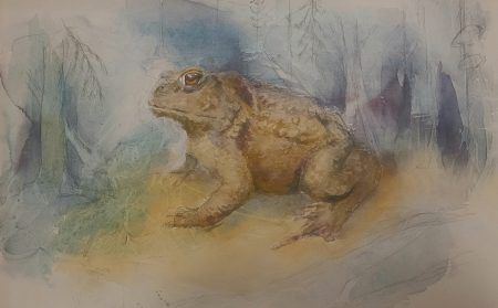 Myöhemmin pääsin kokemaan myös ikimuistoisen sukellusretken Vantaalla sijaitsevaan rupikonnien kutulampeen. Näiden kokemusten myötä olen palannut säännöllisesti rupikonnien pariin maalauksissani. Niiden olemuksessa on jotain ainutlaatuista. Ne ovat kuin jostain ikiaikojen takaa, niiden kuparisilmien katse näyttää viisaalta ja vanhalta.