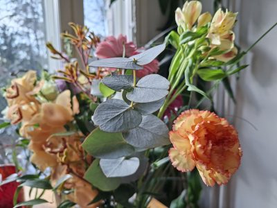 Kotona vieläkin pakahduttava avajaisissa saatujen kukkien meri, joka hohtaa kevätauringossa. Istun ja ihailen niitä joka välissä. Kiitos kaikille kaikista!