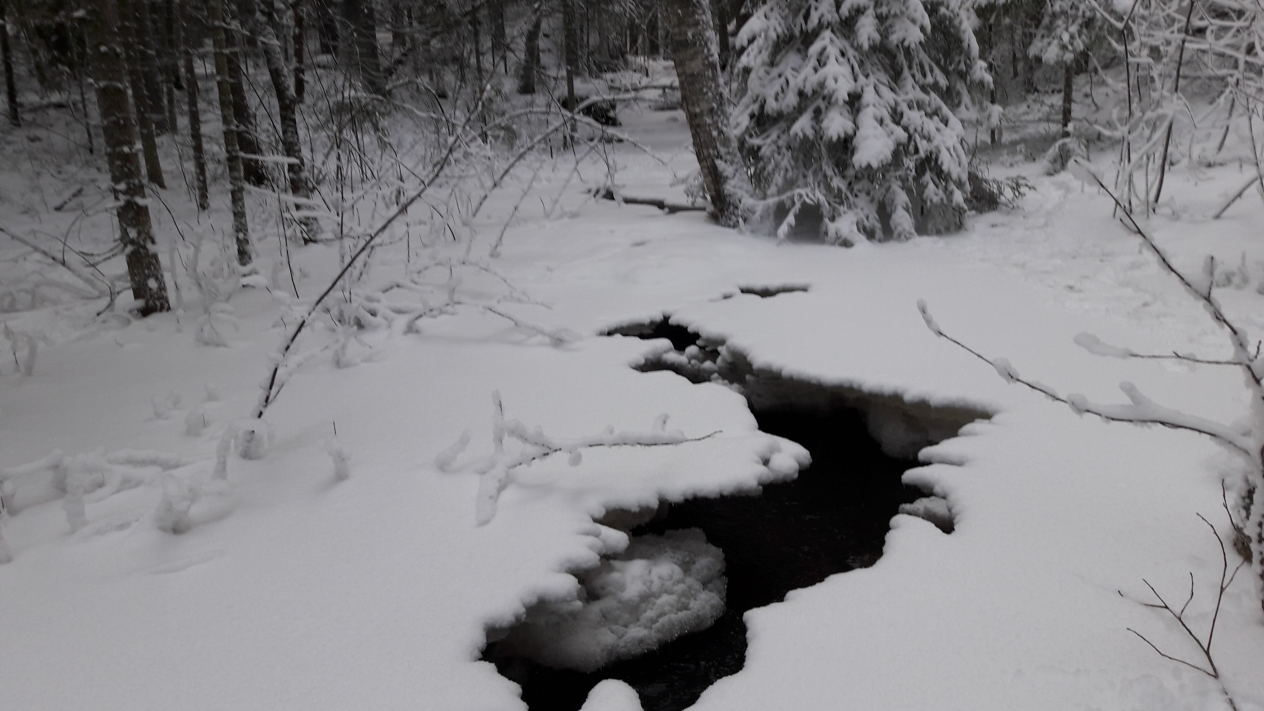 Olen yllättäen innostunut maalaamaan lumista maisemaa. Kävimme Joululomalla Mäntyharjulla retkellä Kallaveden Keisarinlähteellä ja sen vieressä virtaavalla purolla. Oli tyyni, harmaa päivä, puut paksun lumen peitossa ja rungot huurteessa. Lumoava talvimaisema oli täynnä pieniä hienoja lumisia yksityiskohtia. Puro virtasi jääkuoren alla ja kaikui jääseinämistä aivan eri tavalla kuin kesällä. Se näkyi siellä täällä mustina aukkoina jääkannen pinnalla. Olen yrittänyt maalata samaa haurasta tunnelmaa työhuoneella tämän viikon aikana, mutta sitä on vaikea tavoittaa. Pitäisi maalata riittävän kevyesti, jättää tyhjää valkoista kangasta ja ilmavuutta. Olen aloittanut työhuoneharjoitteluni öljyväreillä, mutta houkuttaisi yrittää myös vesiväreillä. Miten paljon uskaltaa jättää maalaamatta? Miten vähillä väreillä selviää? Mitkä viivat saavat maiseman elämään?
