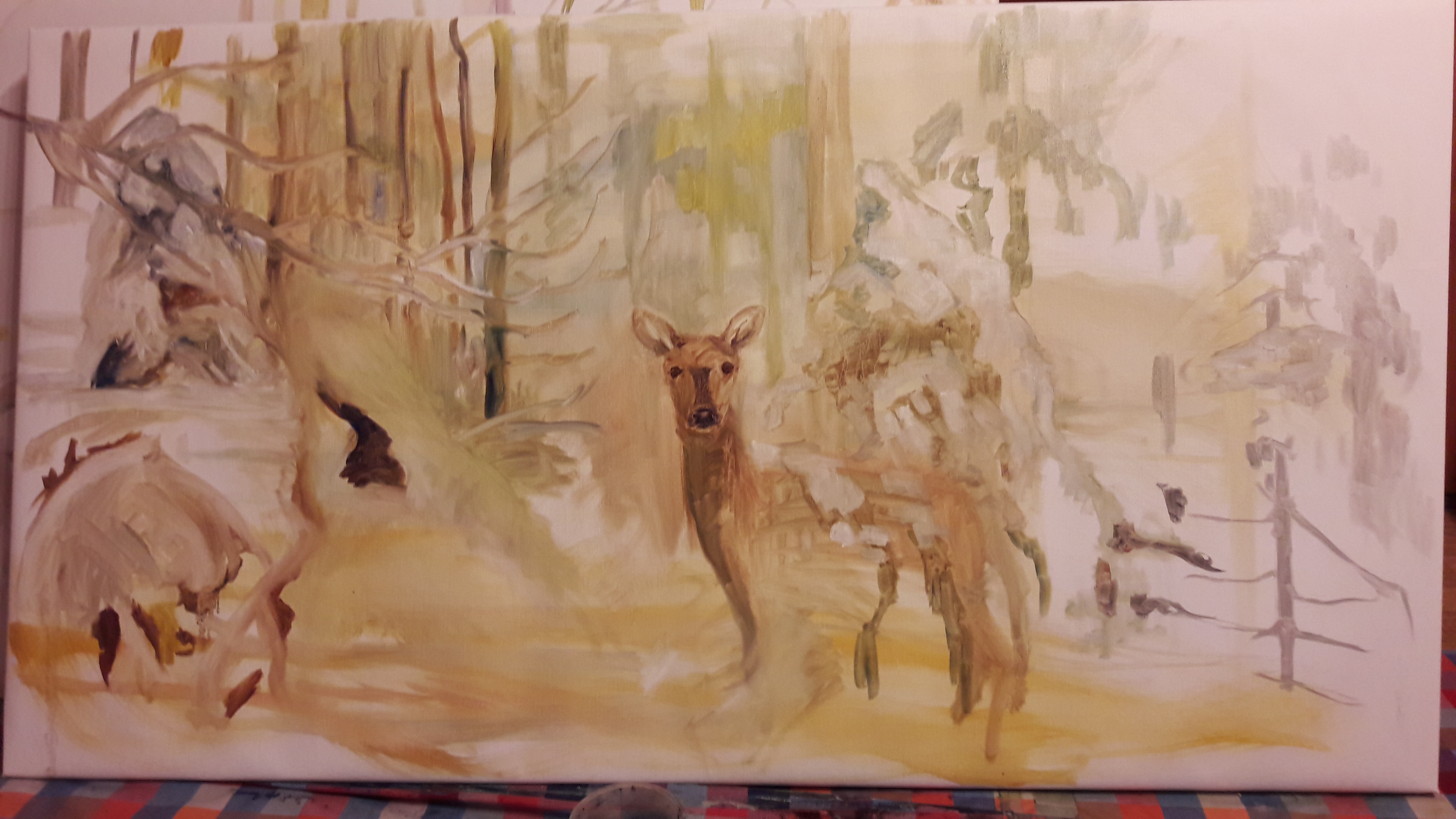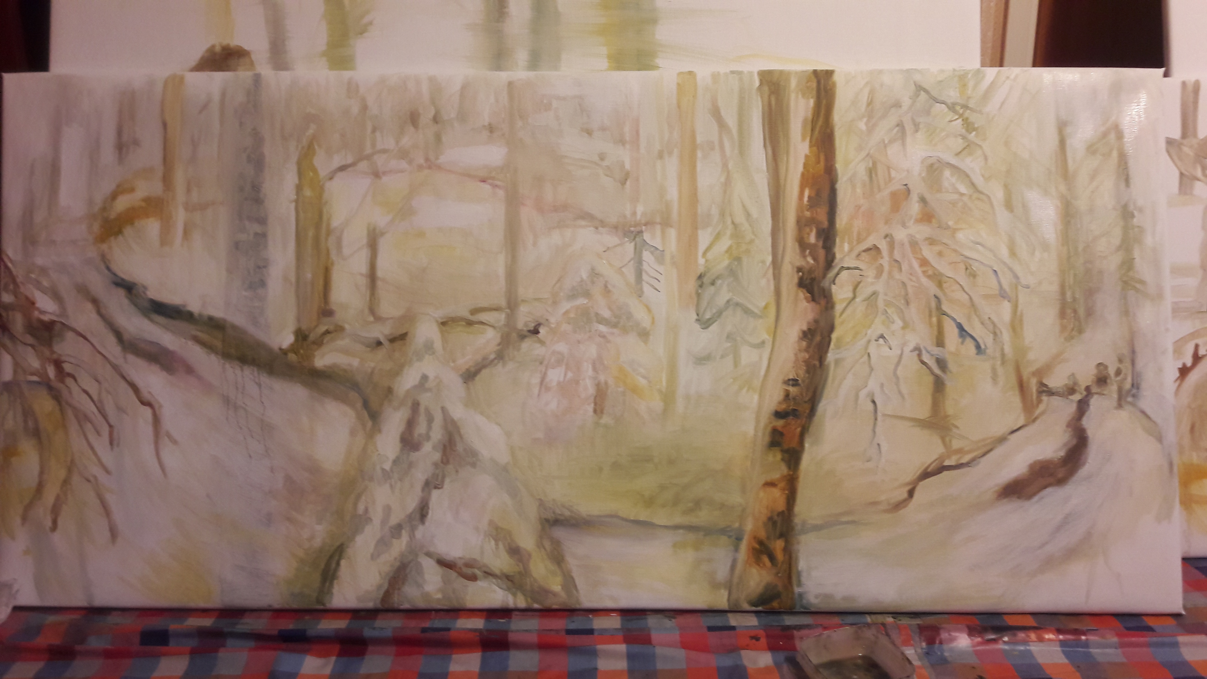 Ohessa ihan kesken oleva lumimaisemamaalaus, josta poistin eilen toinen puunrungon. Voin olla että laitan sen taas takaisin seuraavalla kerralla. Tämmöistä soutamista ja huopaamista tällä hetkellä.