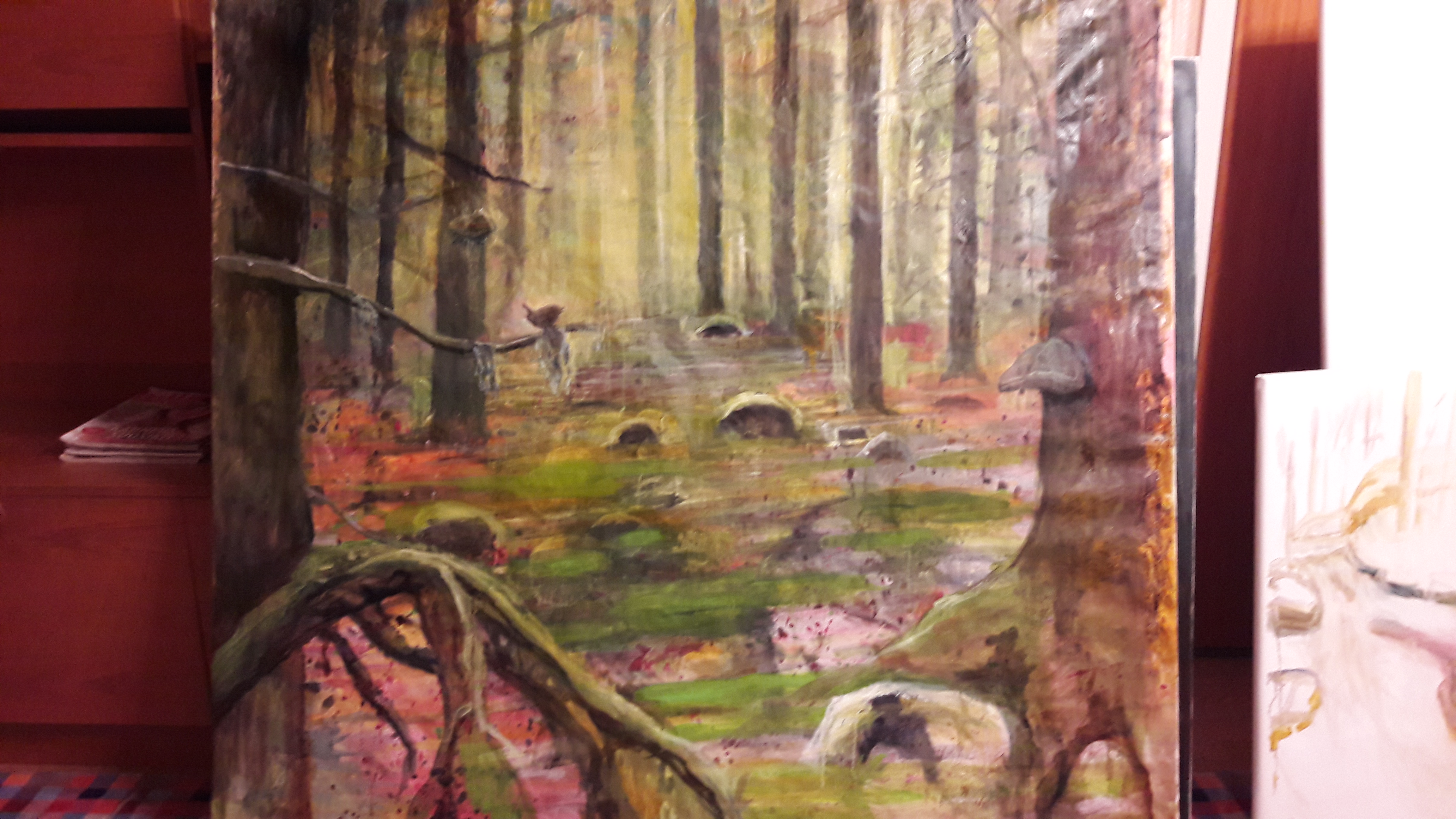 Kuvassa on jollain lailla keskeneräinen maalaus mäyrien metsästä. Lähtökohtana on ollut viime kesän retki hienolle Kyöpelinvuoren metsäalueelle Mäntyharjulla. Kävimme siellä päiväretkellä ja täysin yllättäen näimme metsässä kaksi mäyrää, jotka tonkivat maata niin touhuissaan että eivät huomanneet meitä ennenkuin olimme aivan lähellä. Yritin maalata sitä muistoa kuvaan.