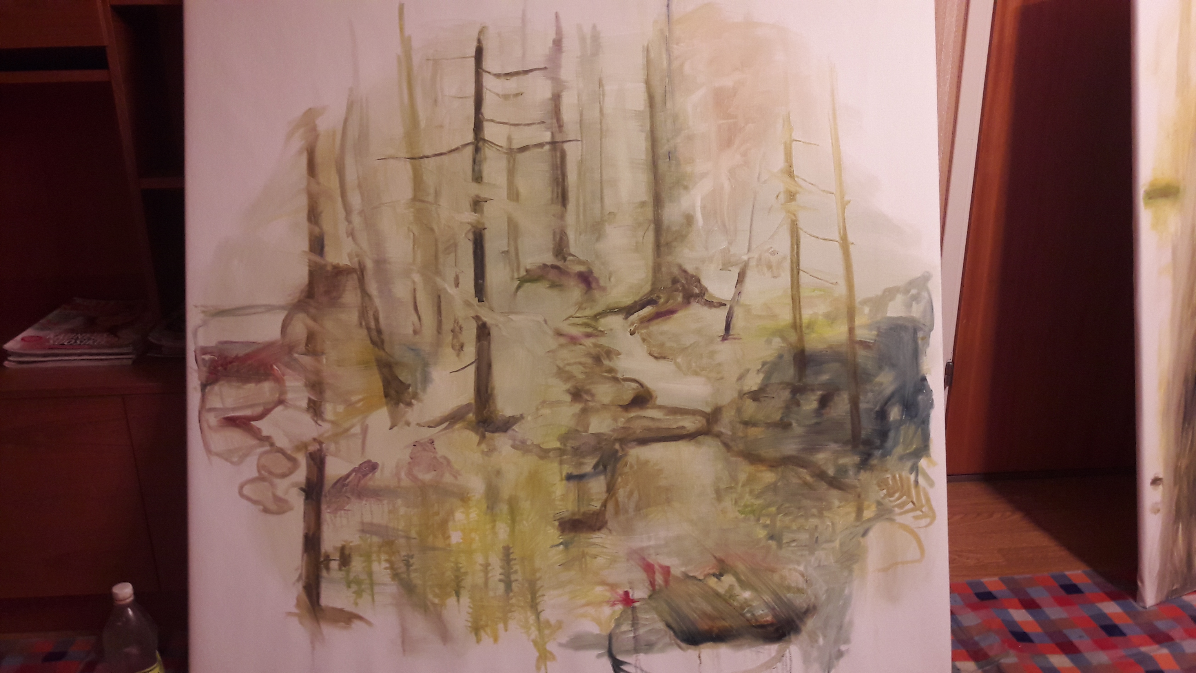 Tähän metsäpohdiskelun perään on pakko todeta, että todellisuudessa mun maalaaminen ei ole yhtään noin “ylevää”. Eilen työhuoneella ei esimerkiksi sujunut yhtään mikään. Pääsin paikalle muiden kiireiden takia vasta kahdelta iltapäivällä. Yritin korvata menetettyä aikaa huiskimalla eri maalauksiin värejä sinne tänne. Vaikka juuri olin päättänyt maalata kevyesti, unenomaisesti. Unohdin kokonaan että yritin tehdä metsämaalausta, joka olisi kuin muisto metsätilasta. Johon voisi astua kuin uneen tai muistoon. Nyt siellä työhuoneella odottaa sähellys jossa on keltaista, punaista, sinistä vihreää. arrghh. Maalasin esim pari tuntia jättimäistä kantoa. Ihan hyvä aihe sekin, ei siinä mitään. Mutta vasta yöllä ymmärsin että haluan maalata enemmänkin metsätilaa. Arkkitehti Lauri Louekari on kirjoittanut hienossa väitöskirjassaan metsän arkkitehtuurista “metsän huoneista”. Sitä kohti yritän itse asiassa pyrkiä, että saisin yhteen maalaukseen ikuistettua tällaisen metsän huoneen, johon voisi kuvitella astuvansa. Sitten vaan muita ajatuksia tulee tilalle ja ne tuntuvat vievän tätä taiteilijaa eri suuntiin. Positiivisesti ajatellen voi tietysti olla että huonot päivät ovat tarpeen että asiat selkiytyvät päässä. Outi Nyytäjä on joskus sanonut että kirkkaasti ajatellun voi myös kertoa selkeästi. Ajattelen että maalaamisen suhteen on sama juttu. Pitää osata pelkistää, kiteyttää, kirkastaa ajatusta, löytää ydin, ja karsia muita rönsyjä pois.