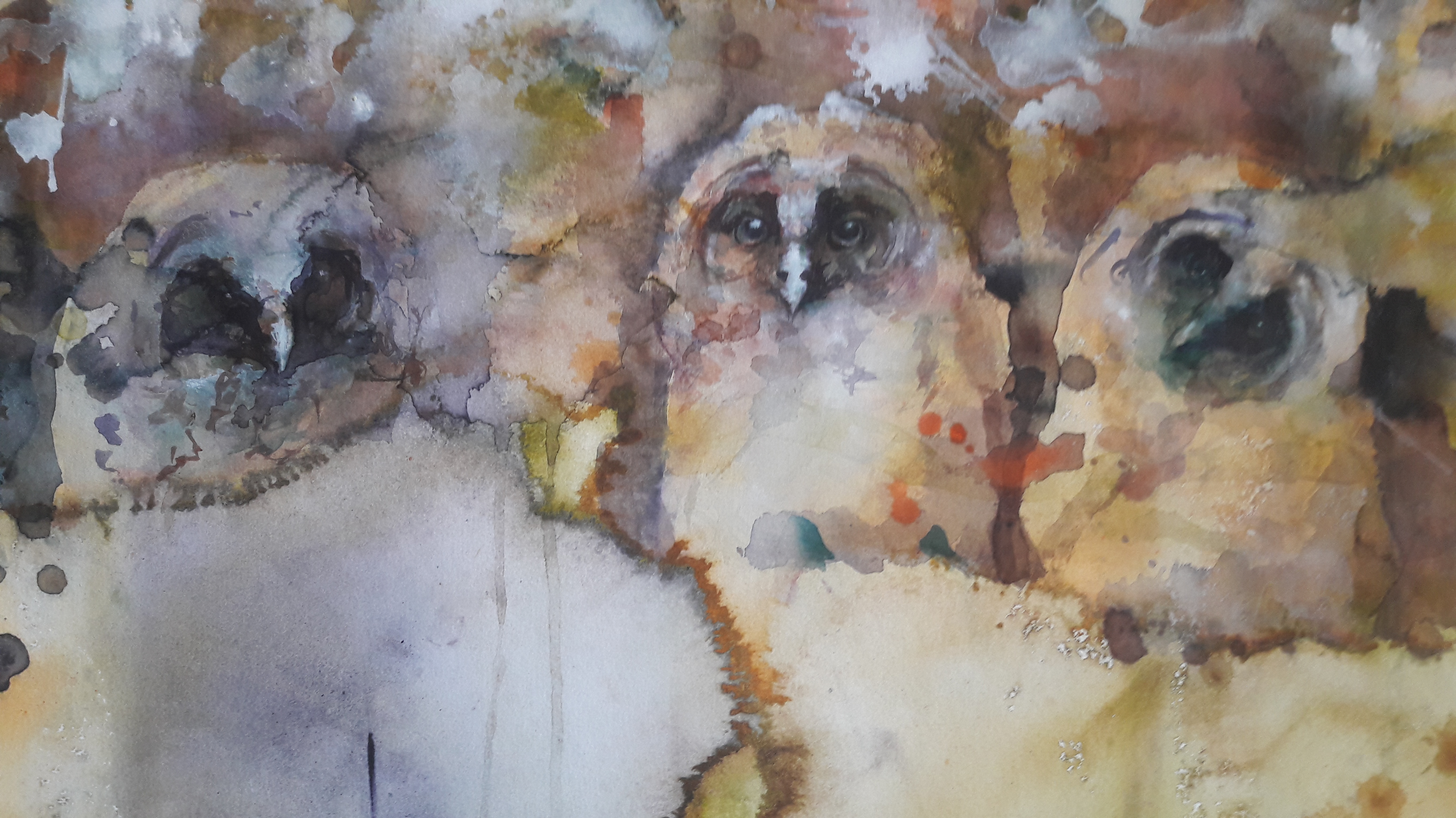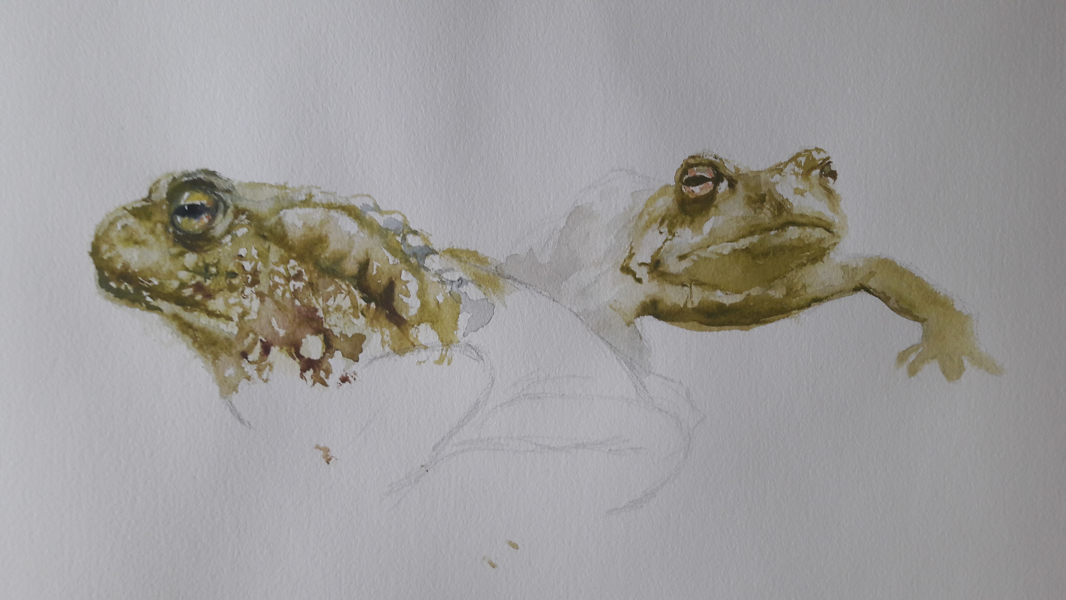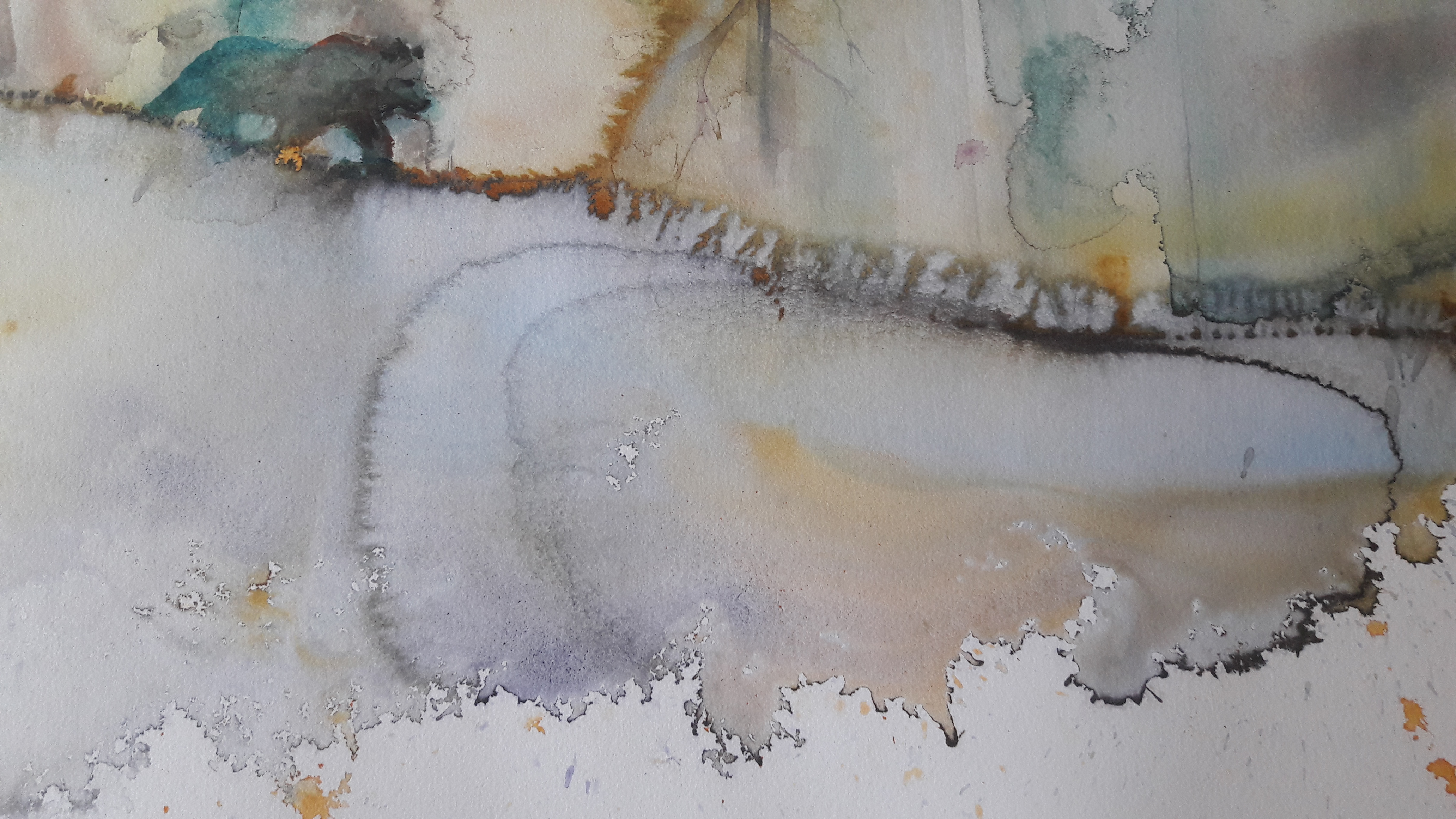 Vähitellen olen kuitenkin innostunut aika lailla akvarellien maailmasta. Koko ajatus siitä, että työvälineenä on vesi, on kiehtova. Marjukka Paunilan kirja akvarellimaalauksesta kertoo tästä hienosti. Ja akvarellimaalauksen hienosta historiasta myös. Olen myös vähitellen ymmärtänyt että monet säännöistä voi rikkoa, ja että tälläkin saralla voi irrotella. Ja että pohjan valo on todella hieno parhaimmillaan. Se hohtaa koko työhön erilaista valoa, kuin tuubista saatu valkoinen. Voi sitä tietenkin öljymaalauksissakin käyttää hyväksi. Akvarelleissa lumoaa myös tietty sattumanvaraisuus. Koskaan ei tiedä ihan tarkasti miten työ etenee ja miltä se näyttää kuivuessaan. Siinä on jotain hyvin elämänläheistä, ja se sopii mielestäni hyvin myös luonnon maalaamiseen. Ohessa esimerkki hienosta sattumalta syntyneestä kohdasta keskeneräisessä maalauksessani. Toivon että saan sen säilytettyä valmiissa työssä, mutta voi kyllä olla ettei se onnistu. Lisäksi esimerkki ihan toinenlaisesta akvarellijäljestä toisella lailla keskeneräisessä rupikonnatyössä.