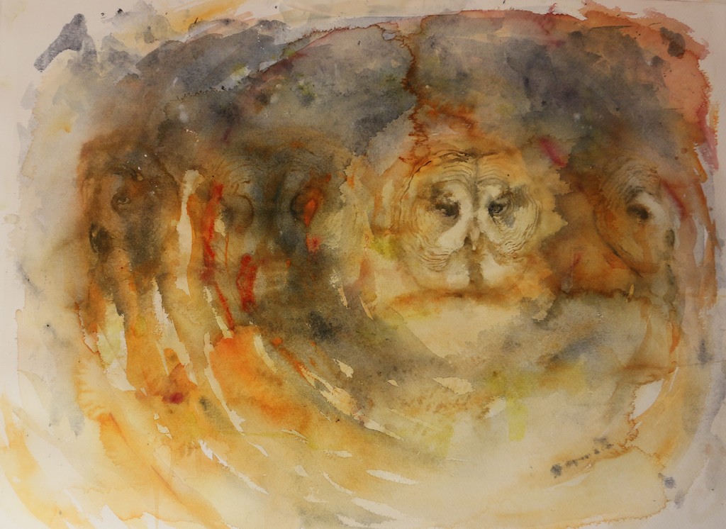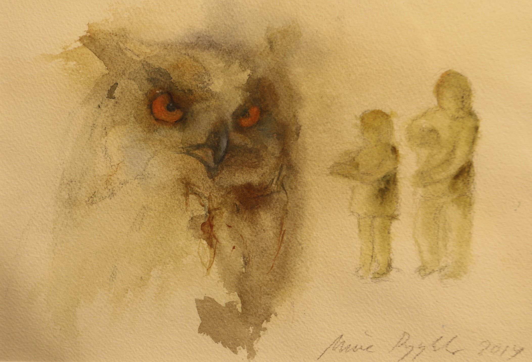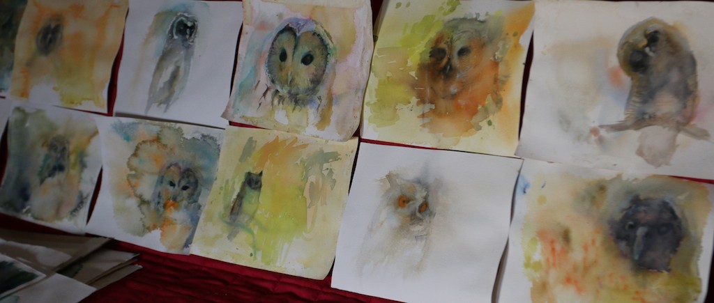 Olen maalaillut kevään mittaan pöllöjä Liminganlahden näyttelyyn. Tänään avautuneessa näyttelyssä on esillä 39 pöllöaiheista akvarellia. Maalaan yleensä useampia töitä samanaikaisesti. Pyörittelen maalauksia edestakaisin, siirrän syrjään ja palaan niihin uudestaan. Tälläkin kertaa yritin pitkään maalata esim maalausta, jossa viirupöllö lentää laakson ja laaksossa olevan surullisen näköisen vajan yli. Jossain vaiheessa tausta meni tukkoon enkä saanut sitä avattua enää. Yritin tummentaa lisää, yritin vaalentaa pöllöä, yritin pienentää työtä. Lopulta oli pakko luovuttaa. Toisessa pilalle menneessä maalauksessa oli kolme pöllönpoikasta tähtitaivaan alla. Olin mielessäni ajatellut haluavani maalata sellaisen työn, koska usein mietin sitä, miltä pöllönpoikasista tuntuu tähtikirkkaassa yössä. Jostain syystä maalaus ei kuitenkaan onnistunut. Edelleen näen selvästi mielessäni vaakasuoran pitkän siniharmaan maalauksen, jossa kolme tai neljä pallomaista lämpimän oloista lehtopöllön poikasta kököttää eri suuntiin katsellen ikuisen tähtitaivaan alla.  Ehkä se onnistuu vielä joskus. Mulle tuntuu usein käyvän niin että liian valmiiksi mietitty teos ei onnistukaan, ja parhaimmillaan sattumalta mukaan tulleet kohdat tuovat jotain  uutta maalaukseen ja tekevät siitä paremman. Tiedän kyllä että toiset maalarit ovat hyvin erilaisia tässä suhteessa. Jotkut aloittavat hyvin vähäisellä alkusuunnittelulla, ettei maalauksesta tule “jäykkää”, ja ajattelu tapahtuu samalla kun kuva syntyy. Toiset taas tekevät paljonkin luonnoksia etukäteen ennen kuin ryhtyvät varsinaisen hommaan. Akvarellitekniikka on armottomampi virheiden paikkailun kannalta kuin öljytekniikka.