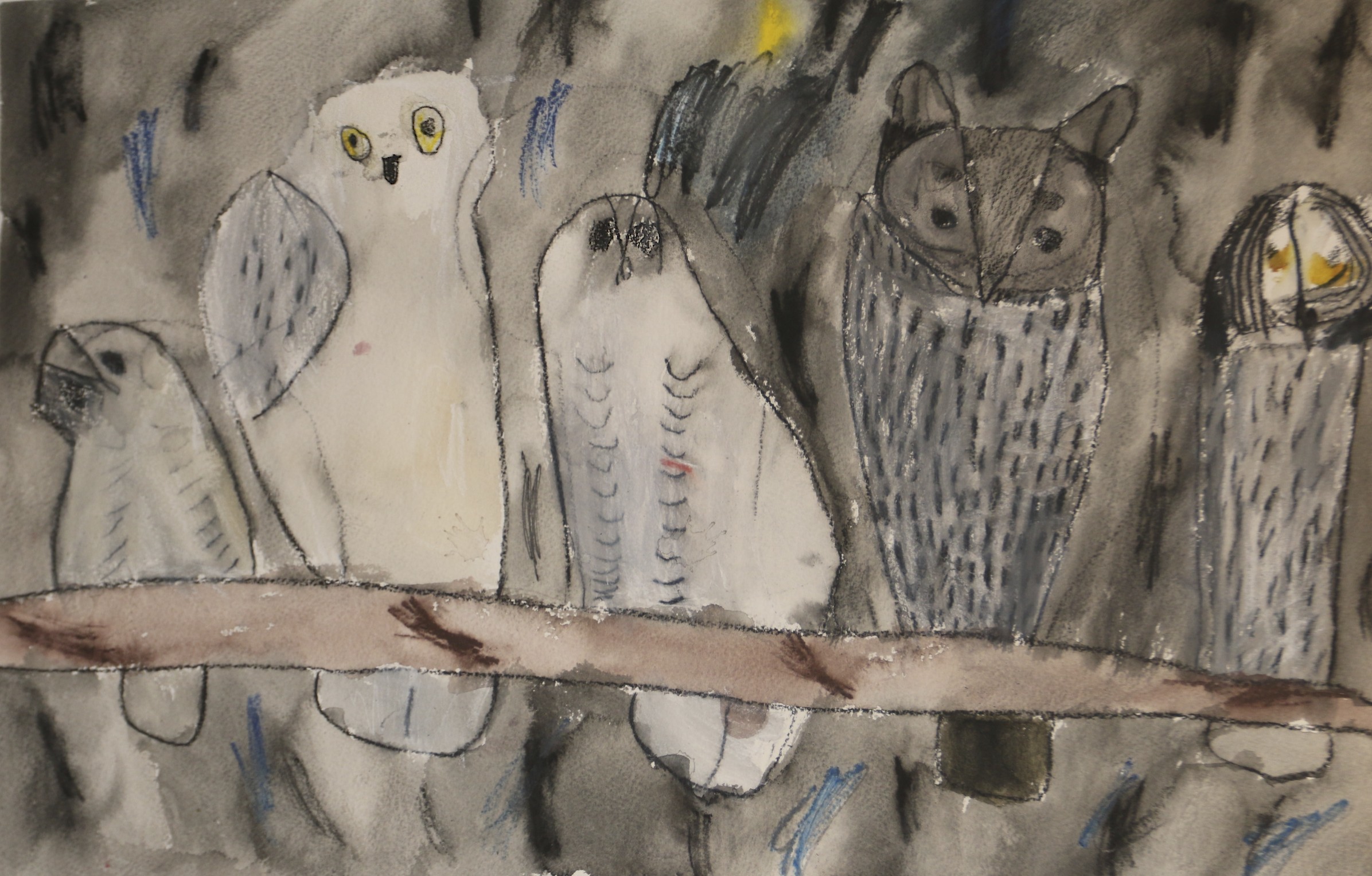 Miten tuoda näkyviin se, että joku on paljolti pelkkää ilmaa höyhenten sisällä? Siihen vähän luurankoa, nokkaa, kynsiä. Ja minkälainen on pöllöjen aistien maailma? Miten ne yössä hahmottavat saaliinsa ääninä, miten äänet piirtävät yöhön niiden reviirien rajat, miten pimeässä värittömässä metsässä näkyvät valonkajossa ääriviivat. Minkälaisina välähdyksinä näkökentän laidoilla saalistajien liikkeet? Ja voiko maalaukseen saada näkyväksi muita aisteja kuin näköön liittyviä? Tietenkin voi. Mutta hankalaa se on.