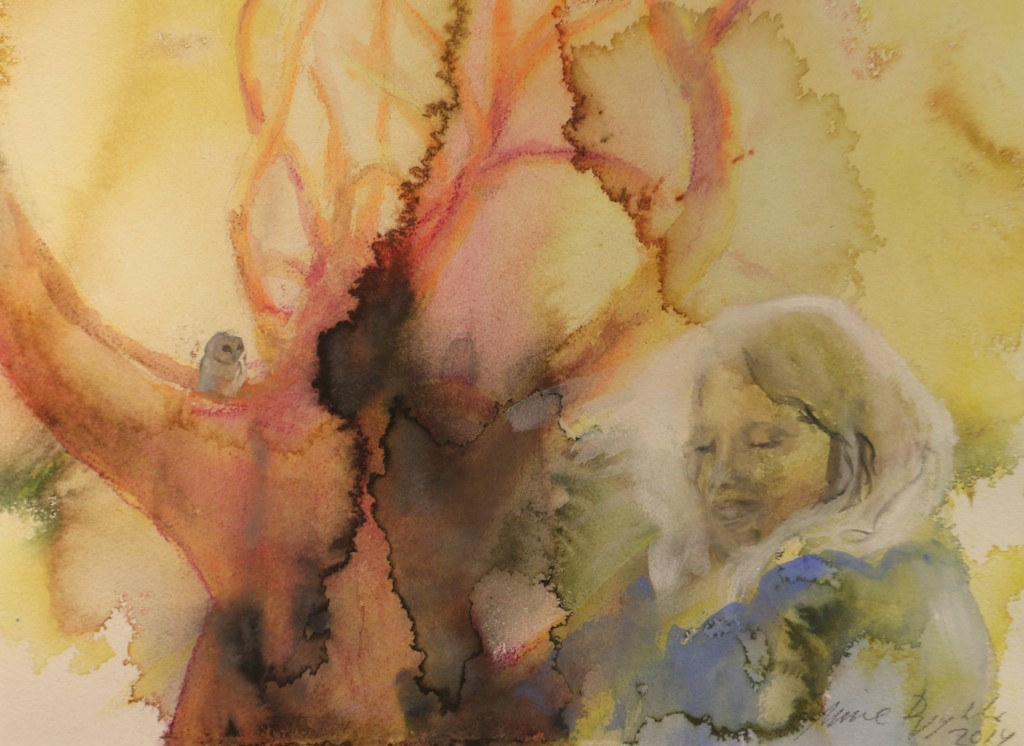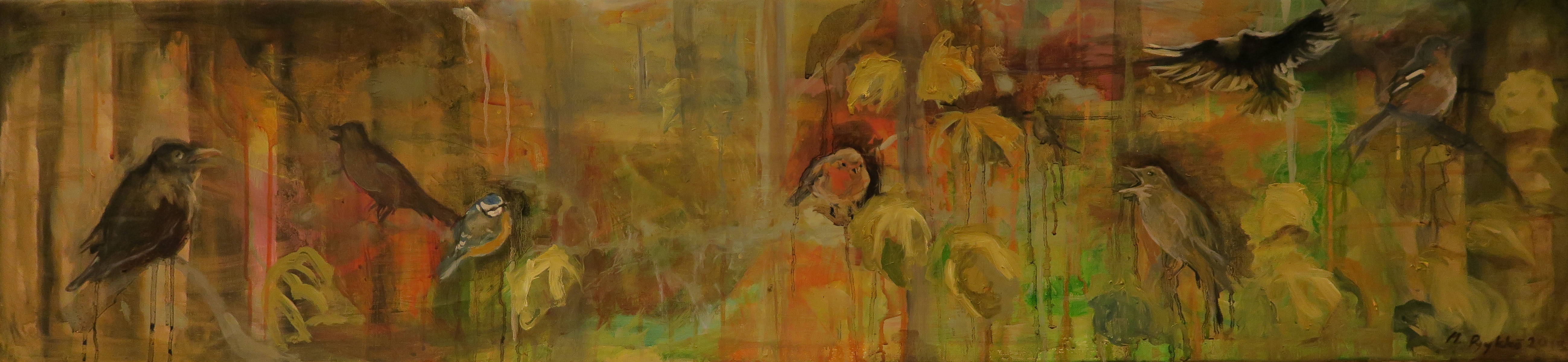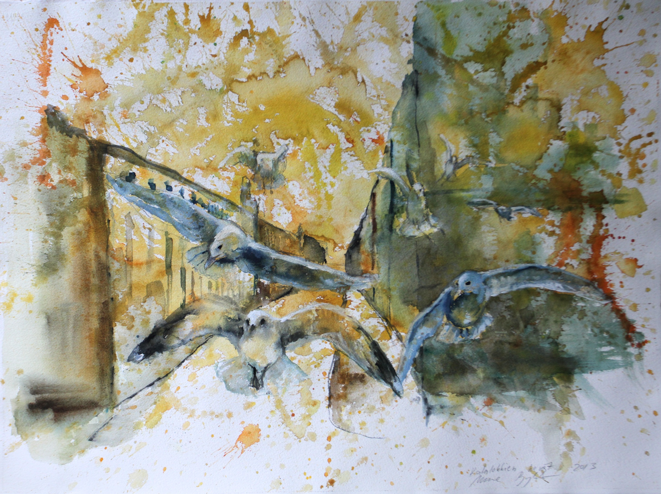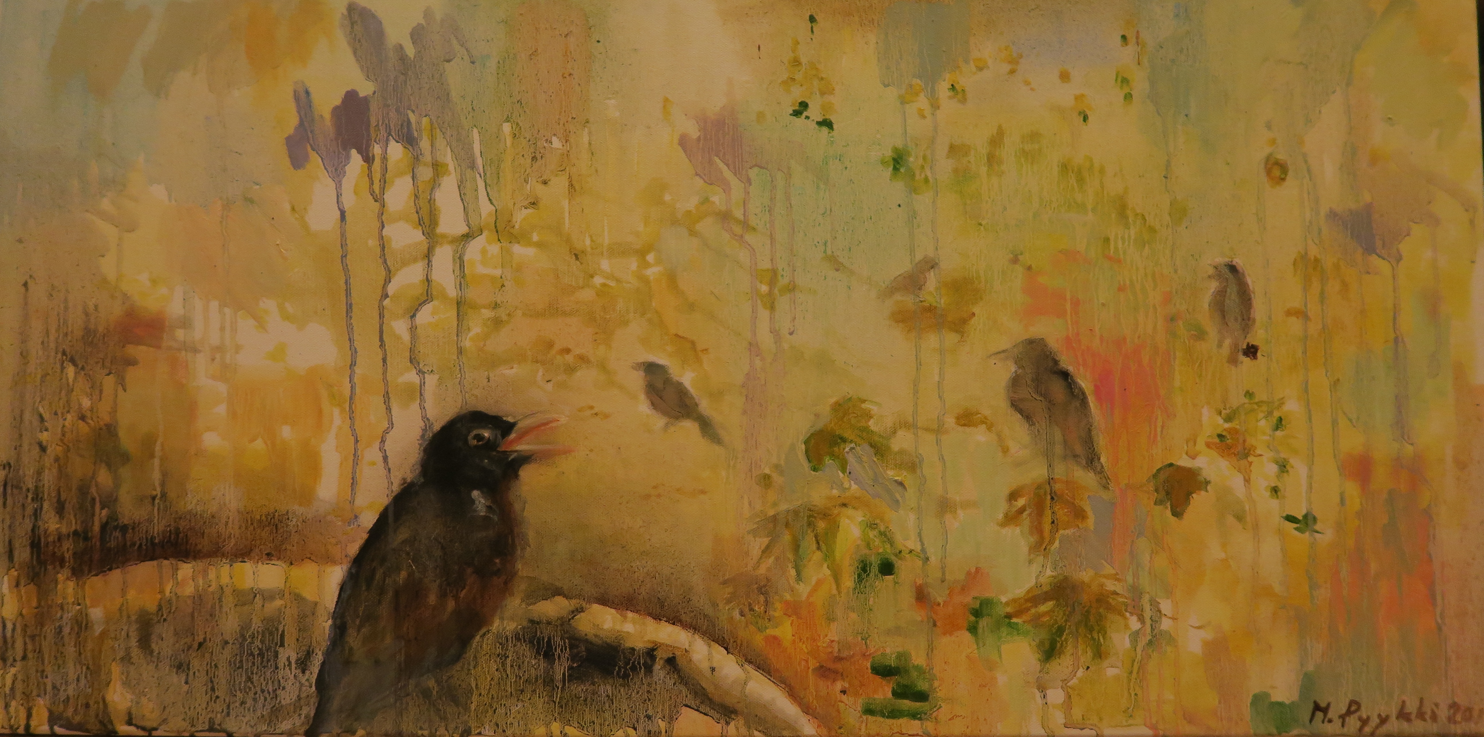 Olen pitänyt Akvartissa kaksi näyttelyä. Ensimmäinen käsitteli kaupunkiluontoa ja toinen pöllöjä. Tämä on hyvä päätös sarjalle. Tähän kiteytyy paljon siitä, mitä olen viime vuosina maalatessani miettinyt. Vesivärit tuntuvat sopivan hyvin kuvaamaan hauraita, läpikuultavia päiviä, kehon läpi puhaltavaa tuulta, satoja pieniä kiivaasti sykkiviä sydämiä, vuosien kerroksia muistoissa.