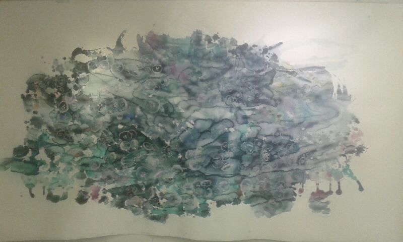 Näyttely “Kuulin allien laulavan” on auki 22.12. asti. Siihen mennessä on myös toivottavasti valmiina maalaus tuhannesta meduusasta rantavedessä. Teen sitä näyttelyn aikana molempina sunnuntaina (13.12. ja 20.12.) klo 14-16.  Varmaan joudun kyllä maalaamaan muulloinkin, että saan ne tuhat tehtyä! Luin aikanaan Kurt Vonnegutin kirjaa Siniparta, jossa taiteilija maalaa ladossa vuosien ajan aivan kohtuutonta määrää sotilaita ja yksityiskohtia sotatantereelta aivan hillittömän kokoiseen maalaukseen. Ajattelin silloin että olisi hauska kokeilla samaa haahkoilla. Olisi jännä nähdä minkälainen kokonaisuus syntyisi esim 10 000 haahkasta. Tänä syksynä Utön saarella katselin kuitenkin erityisesti meduusoja, joita kertyi sopiviin kohtiin rantaveteen valtaviksi massoiksi. Päädyin aloittamaan tämän kokeiluni meduusoista. Mietin että voisi olla hauska seurata sitä, miten meduusamaalaus etenee. Tuleeko teokseen lisääntyvien meduusojen myötä lisää tilan tuntua, vai meneekö puuroksi?