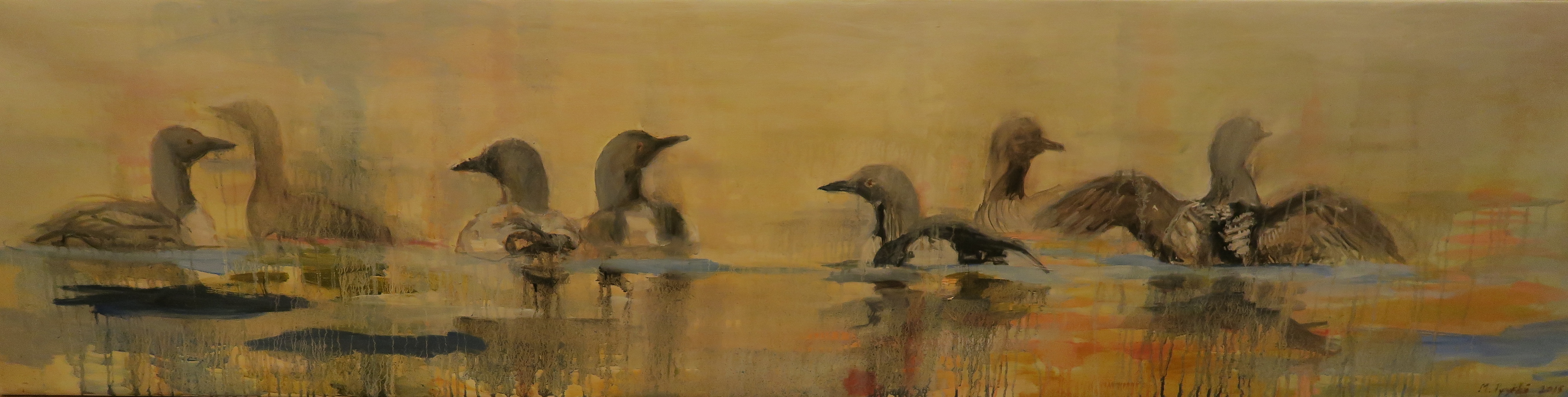 Sain tilauksen maalauksesta asunnon parvekkeelle vievien ovien yläpalkkiin. Päädyimme öljyvärimaalaukseen, koska akvarellien lasi saattaisi tuntua turhan jännittävältä pään yläpuolella. Aihe oli muuten vapaa. Mietin maalauksen paikkaa ja tilaajia. Halusin maalata jotain iloa, valoa ja voimaa tuovaa. Ensimmäinen ajatukseni oli jatkaa luontoa sisälle ja maalata ulkopuolella näkyviä vaahteroita ja kaupunkilintuja. Sitten päädyin maalaamaan kuikkia, joita olemme seuranneet vuosien mittaan Mäntyharjun maisemissa.  Tässä kaikki ehdotukseni. Yksi näistä oli tilaajille selvästi yli muiden ja onneksi mieleinen. Sunnuntaina pääsen kylään näkemään miltä työ näyttää oikealla paikallaan!