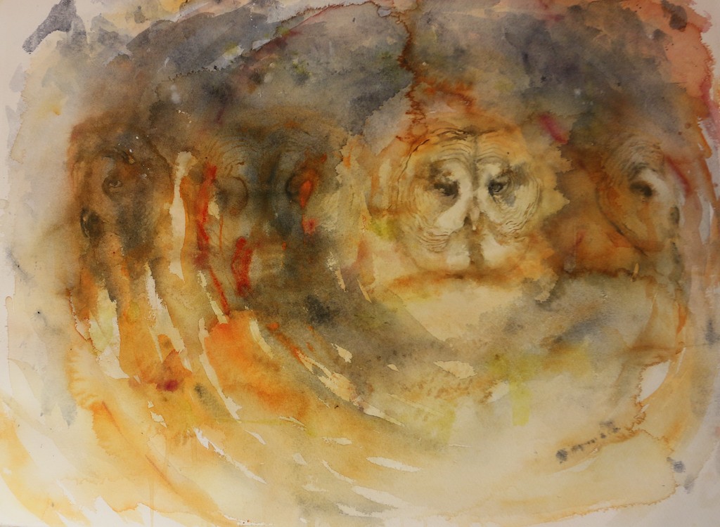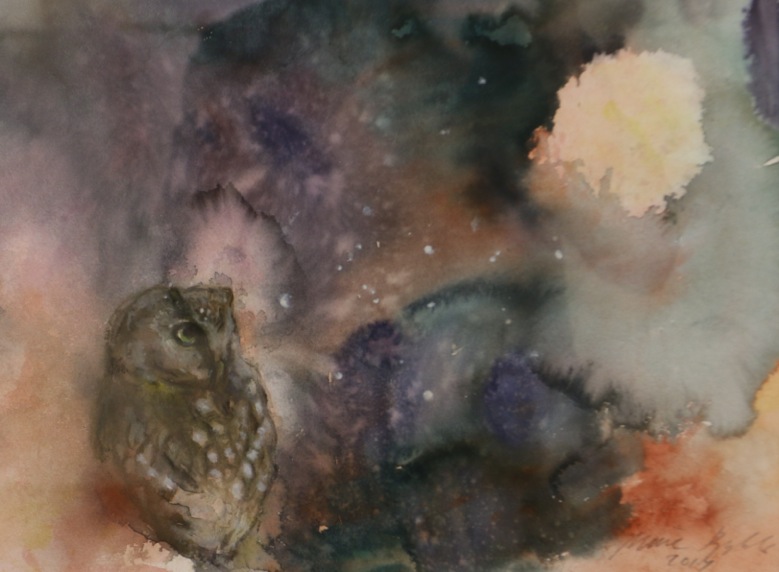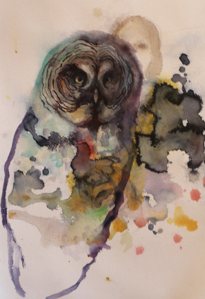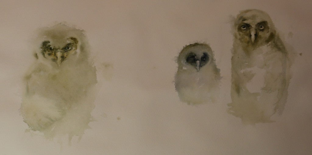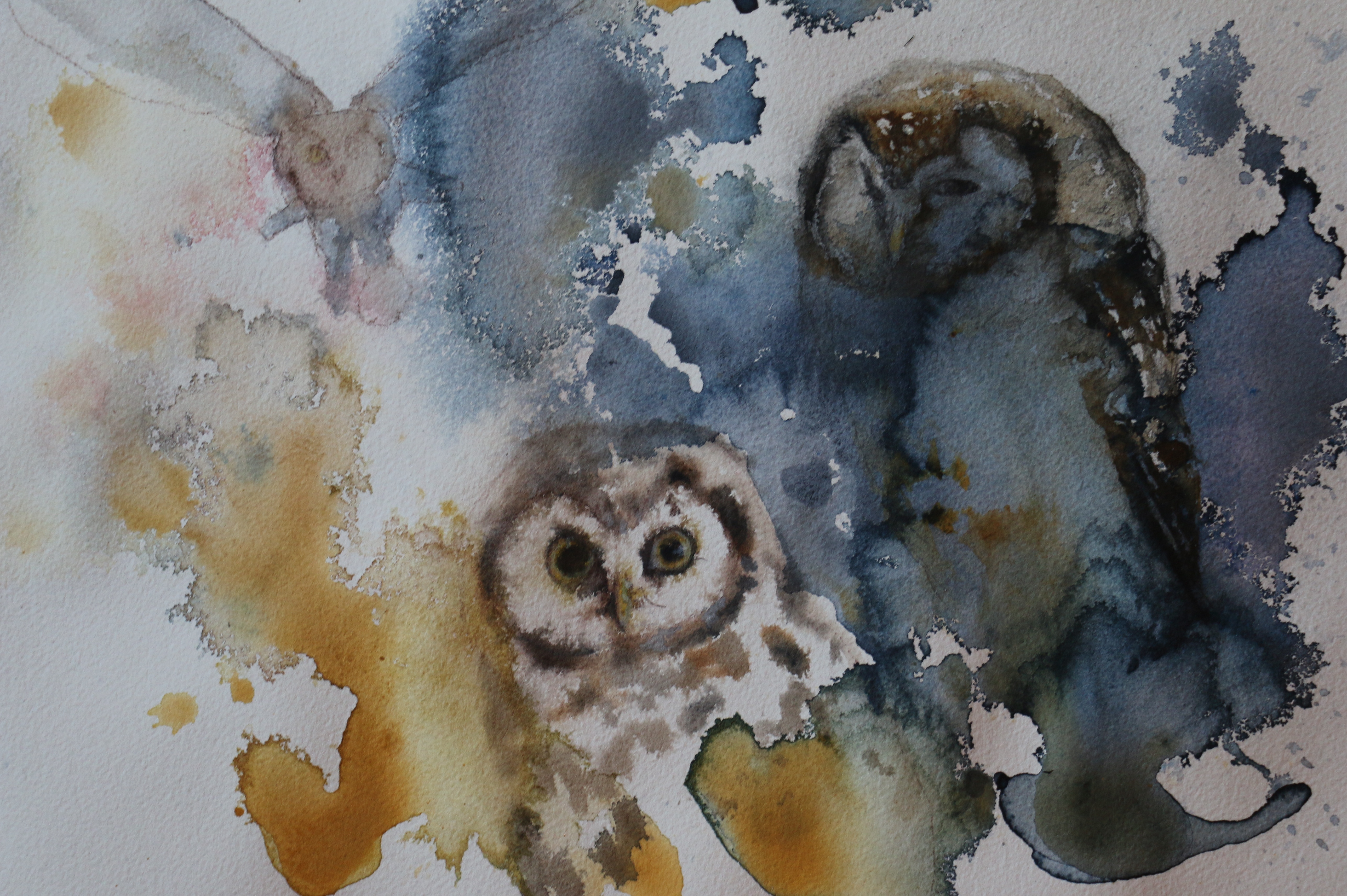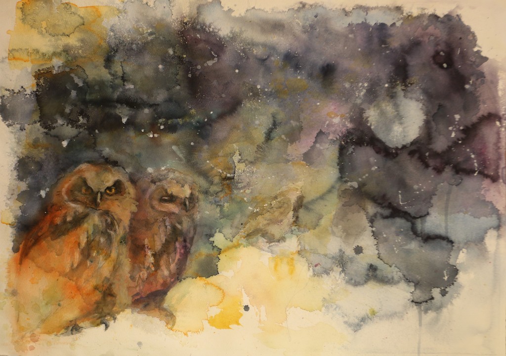 Akvarelleja maalatessa pitäisi muistaa jättää valkoisia kohtia. Tai ei se mikään sääntö ole, mutta usein jälkikäteen huomaa, että jos kaiken maalaa täyteen, ilmavuus katoaa. Akvarelleissa käytetään pohjapaperin valoa hyväksi ja onnistuneimmillaan se hehkuu raikkaasti. Olen nähnyt  hienoja akvarelleja,  joissa vahvat väripinnat ja tyhjät valkoiset alueet toimivat hienosti – maalaus on kuin loppuun asti mietitty ajatus. Itse teutaroin valkoisen kanssa. Tänään viimeksi sähläsin yhtä maalausta huonompaan suuntaan lisäämällä työhön tumman tähtitaivaan. Ensin se näytti  lapinpöllöjen yllä hienolta mutta hetken kuvaa katsottuani työ alkoi näyttää  laimeammalta, jotenkin vesitetyltä. Huomenna yritän tehdä lumimaisemia, joissa lumi on valkoista – ehkä voisin päästä lumimaalauksilla johonkin esittävän maiseman ja abstraktin välimaastoon.