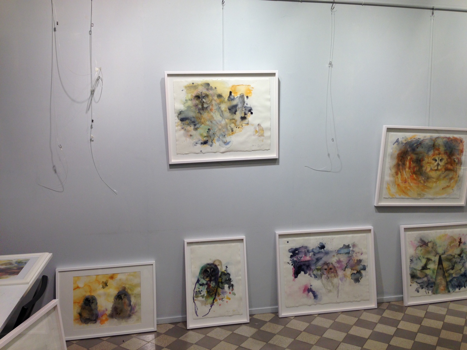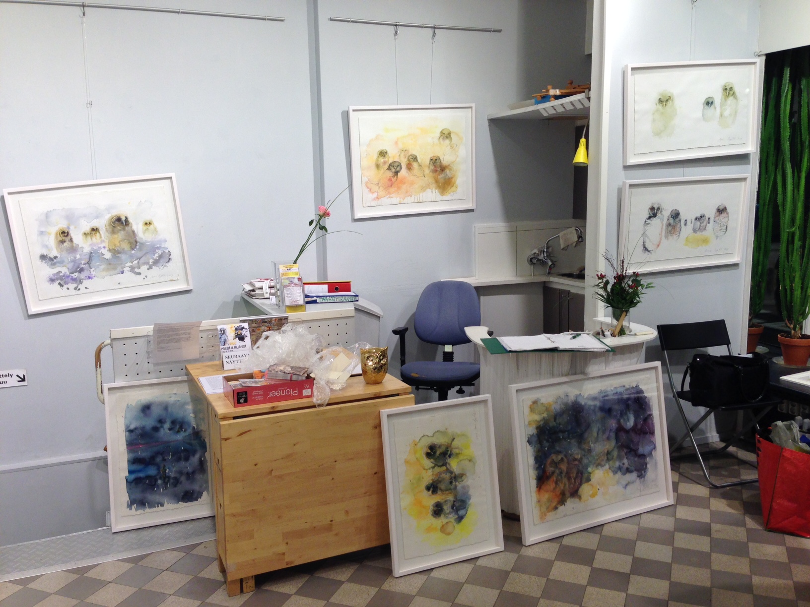 Näyttelyn ripustus alkoi eilen ja jatkuu tänään. Viiteen mennessä pitäisi olla valmista. Avajaiset tänään 17-19, ja näyttely on auki tästä eteenpäin 19.12 asti! Tervetuloa kokeilemaan, miltä tuntuu kun pöllöt tuijottavat!