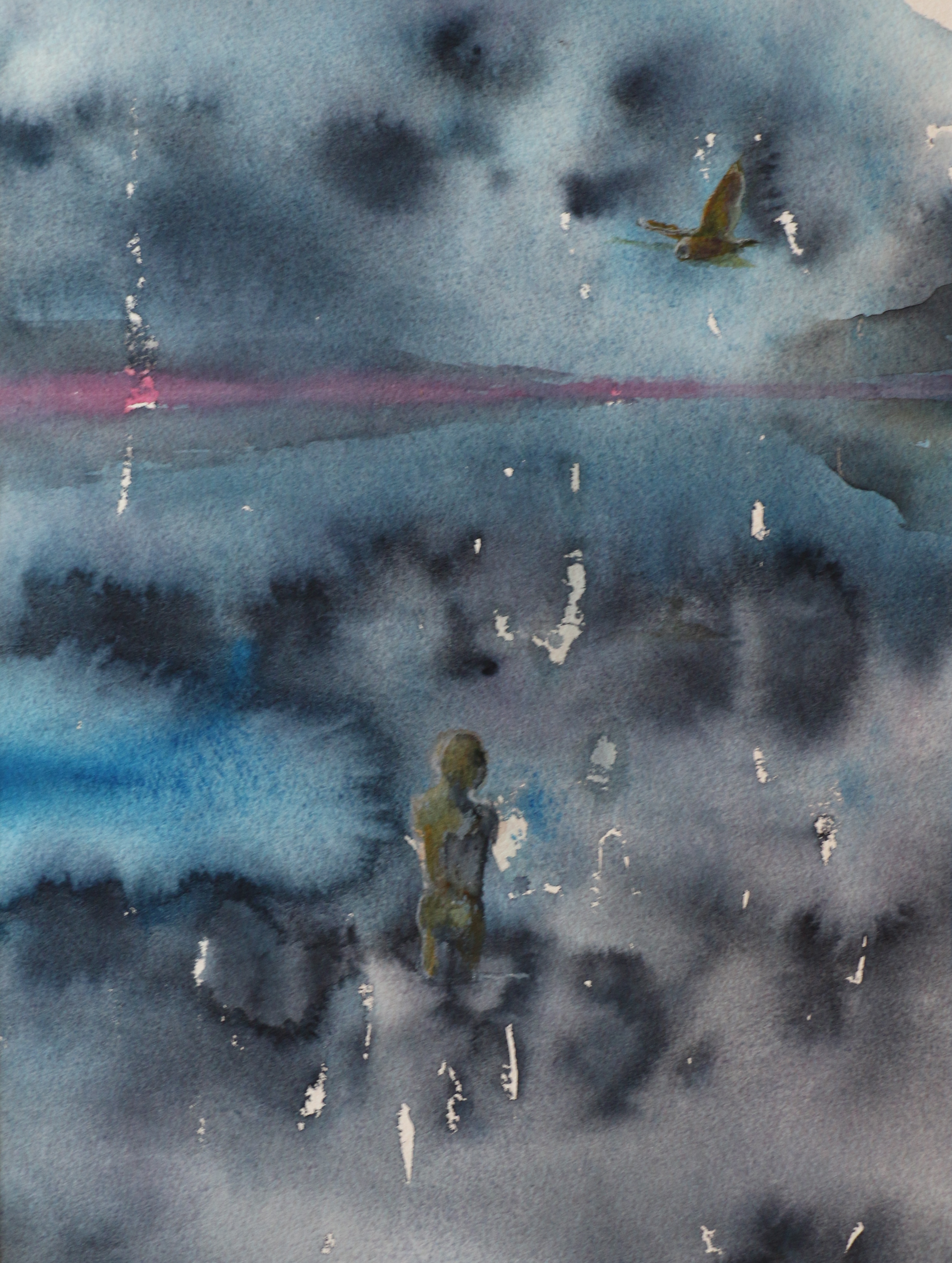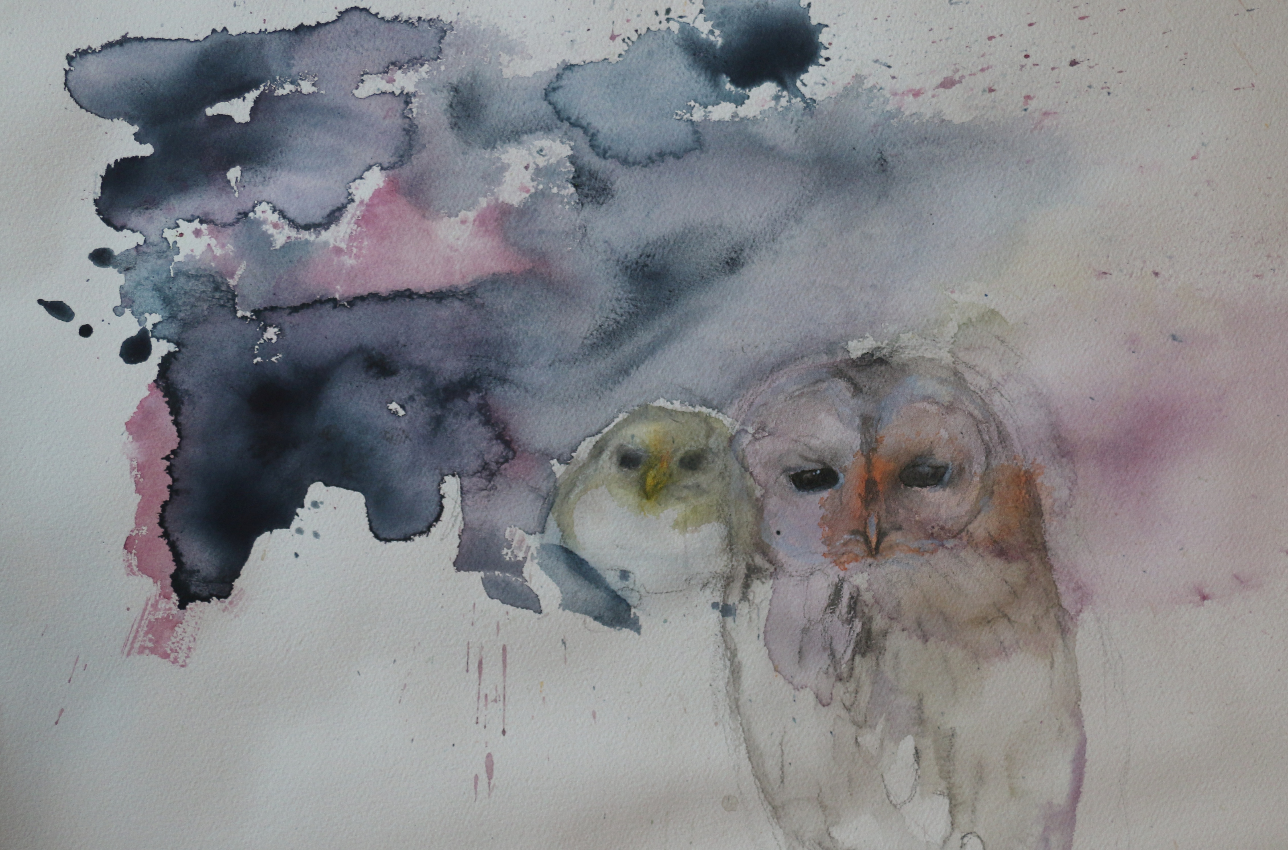 Olen pöllöjen kautta sukeltanut yöhön. Voiko akvarelleilla maalata pimeää? Saanko maalauksiin jälkiä kylmistä pöllöretkiöistä, pakkasista ja sinisenä hohtavista hangista, tähtitaivaista, valoisista lämpimistä kesäöistä tai sateisesta syksyn hämärästä?