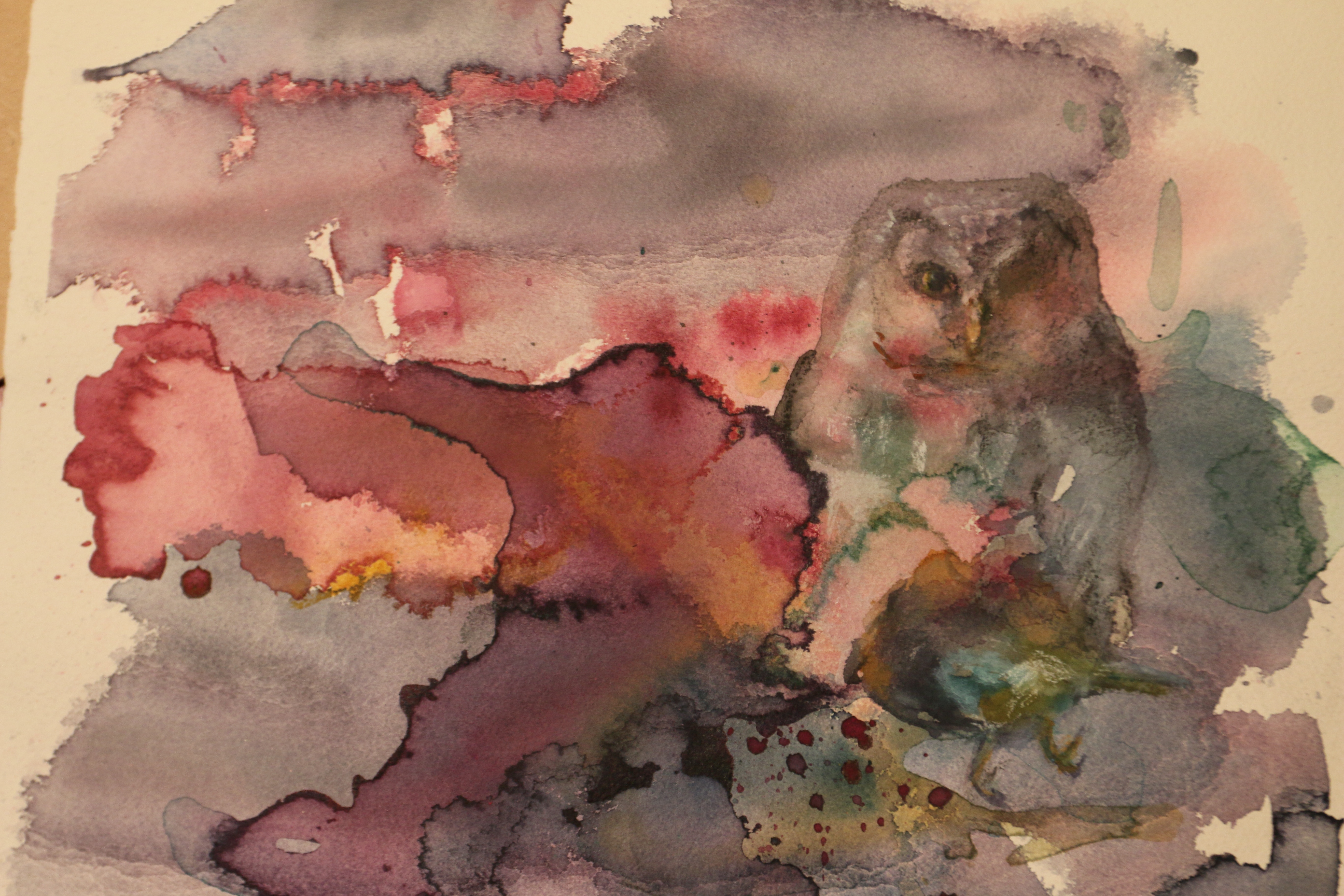Keskeneräinen viirupöllö odottelee että taiteilija pääsisi eteenpäin! Parhaimmillaan akvarelleilla saa raikasta ja hengittävää jälkeä. Pahimmillaan maalaus menee tukkoon ja pitää aloittaa alusta. Se oli mulle yllätys, kun pari vuotta sitten uskaltauduin akvarellien maailmaan, että akvarellimaalaustakin voi kuitenkin hyvin jatkaa useina päivinä ja korjaillakin. Ja voi maalata hakutesssaan voimalla, eikä vaan hempeän herkästi.