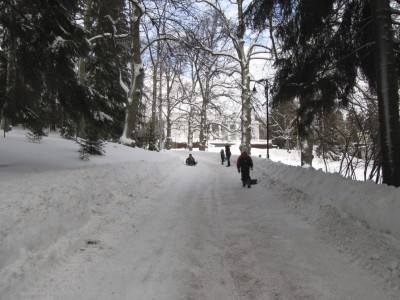 Olimme illalla pulkkamäessä ja poikia nauratti kovasti. Muistan hyvin samat hommat omasta lapsuudesta, kun kierähdimme pulkasta vetäjän huomaamatta Paloheinän mäessä. Kävimme joskus pulkkailemassa Kaivopuistossakin, kun ukki ja mummi asuivat lähistöllä. Muistan selvästi vieläkin sen kun kerran nuori miestarjoilija tuli Kaivohuoneelta tarjoiluasussaan, ja laski mäen seisaallaan hopeisella tarjottimella! Ja meni sitten takaisin töihin.