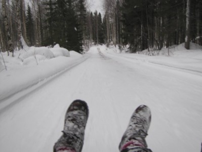 Pulkalla lasku onnistui hyvin auratuilla teillä. Välillä luisti niin liukkaasti, että käytiin penkan puolella. Varsinkin Juha ja minä, kun jokainen liike ei ole enää ihan ketterimmästä päästä.