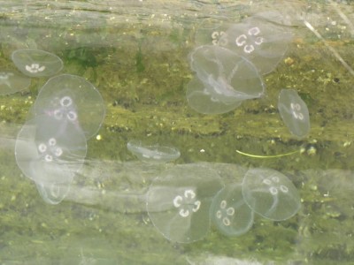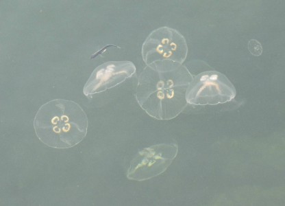 Tyyni huippuaamu. Jututin Skaftungin Kari Korhosta, joka kertoili lintukurssien vetämisestä. Fotofennican lintuvarustekauppias Mikko Kataja naureskeli kameranpuhdistuskuvalleni. Eivoriin suuntasi nyt iso joukko töihin palaajia. Satamalaiturilta näkyi paljon meduusoja, myös muutama ei-neljäkorvainen. Kun puolen päivän aikaan yritin taas mennä kuvaamaan niitä, ei onnistunut. Taivas oli mennyt pilveen ja meri aaltoili. Ei meduusojenkaan kuvaaminen ole ihan helppoa.