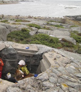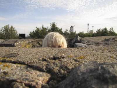 Etelätuuli tuntui raikkaalta muutaman hellepäivän jälkeen. Lasten majan viritys bunkkerilla jatkui melkein koko päivän. Lapset ovat haalineet kaikenlaisia aarteita majalleen, komea paksu köysi on raahattu melkein saaren toisesta päästä asti. Muuta aarteistoa ovat vanha saha, toimimaton sytkäri, likainen lippalakki, nestesaippua, kampa, juomalasi – kaikkea sitä saaresta löytyy. Vein iltapäivällä majalle teetä ja voileipiä. Aikuiset eivät majaan mahdu. Tyttö on ystävystynyt Jasu-koiran kanssa, ja kaverukset touhuavat tuntikaupalla yhdessä kaikenlaista hauskaa.
