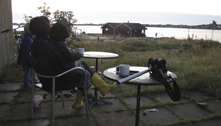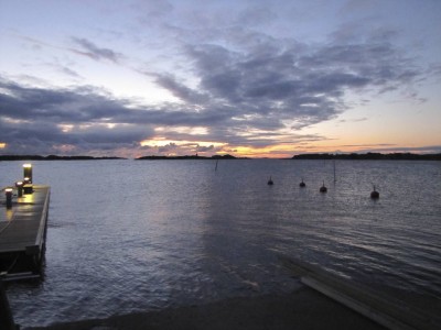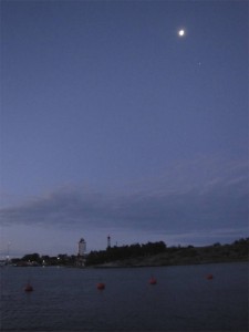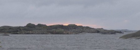 Nukuimme jostain syystä huonosti ja keikuimme Juhan kanssa hereillä jo aamuviideltä. Niinpä pääsin juomaan ensimmäisen aamukahvin tähtitaivaan alla, ja toisen kupillisen kun taivas oli jo vähän vaalentunut, tähdet hävinneet ja taivaanranta idässä punertui. Käyskentelin laiturilla kahvikupin kanssa.