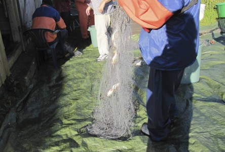 Brita ja Vili kävivät nostamassa verkot. Kalansaalis oli hurja, ja kaloja jaettiin saarelaisille. Menimme perkausavuksi. Ehdin mukaan siinä vaiheessa kun edessä oli kilohailin eli vaspuukin perkaus. Se on silakan pienikokoinen sukulainen, erona terävämpi vatsa, pienempi, pyöreämpi pää, ja selässä vihertävää sävyä. Lisäksi verkoista tuli parikymmentä kuoretta eli norssia, siikoja huippumäärä, kampeloita, ahvenia ja muutama siloneula ämpärissä ihmeteltäväksi. Kävimme kysymässä kokki- Eerolta, ehtisikö hän vielä viimeisenä työpäivänään paistaa kilohailit meille hotellilounaaksi. Eero suostui ja olivat huippuhyviä.