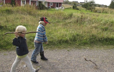 Pyörimme poikien kanssa pihapiirissä. Pojat keksivät valmistaa itselleen puhallusputket ontoista kuivista kasveista, ja käyttivät pihlajanmarjoja ammuksina. Putket eivät onneksi toimineet liian tehokkaasti. Vähän sotkuisempi leikki oli lätäköiden yli hyppely jonka jälkeen vaatteet piti vaihtaa alushousuja myöten.