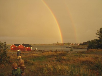 Illalla satoi kun kävimme kirjastossa seitsemän aikaan. Sitten sade yllättäen loppui, valo muuttui lämpimän keltaiseksi ja satamalahden yli kaartui huikean hieno sateenkaari, koko puolikaari, jonka toinen pää ulottui Ormskärille ja toinen Lumijärvien talolle.