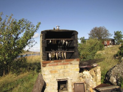 Juha viiletti savustimelle toiveikkaana kun tuli oli hiipunut, ja kurkisti sisään. Hetken raksutti tyhjää, mies tuijotti näkyä käsittämättä mitä oli tapahtunut. Osa kaloista oli pudonnut tulipesään. Pelastimme sen mikä oli pelastettavissa, ja otimme opiksi ensi kertaa varten. Ainakin savustusritilä kannattaa laittaa alle.