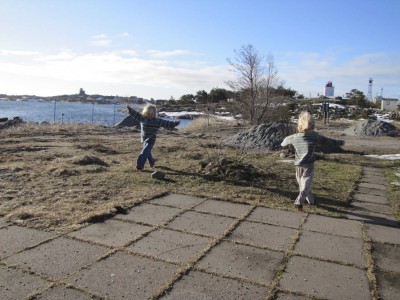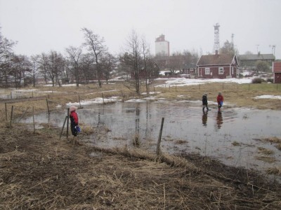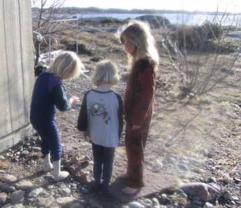 Saaressa on viime päivinä ollut käynnissä mittava kevätpuro/kuraleikki, johon meidänkin joukko nuorinta lukuun ottamatta osallistuu. Kengät hörppivät, vaatteet kastuvat ja kuraa kertyy kaikkialle, mutta hauskaa on. Illallakin tyttö lähti vielä saunapuhtaana läksyjenteon jälkeen kuraleikkeihin ”tekemään kevättä”.
