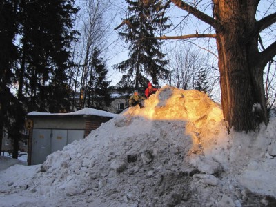 Kävimme katsomassa Hevosenkengässä Pikku Prinssin. Mummulan pihan lumivuori oli iltavalossa kultainen.