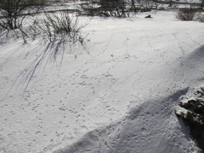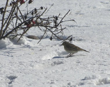 Ensimmäinen aamu alkoi hienosti: kymmeniä kiuruja tepasteli etupihan lumihangella.