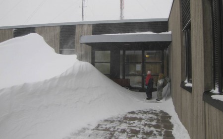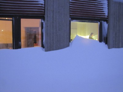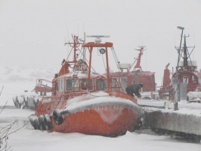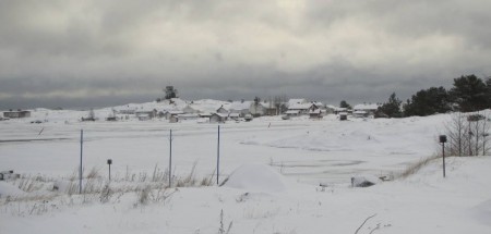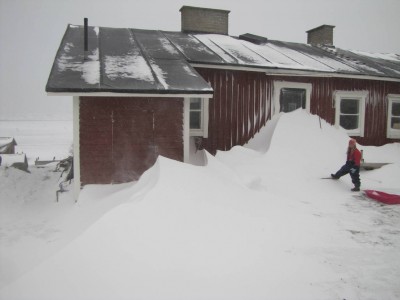 Tuuli on muodostanut hotellin sisäpihalle monta metriä korkea harjanteen. Saaren notkelmissa on lunta niin että sinne voi aikuinenkin humpsahtaa. Laiturilla hakataan jäätä pois oranssista kutterista. Lunta on niin paljon, että talojen ikkunat ja ovet ovat peittyneet lumeen. Nyt on helppo nähdä, missä taloissa asutaan ja missä ei. Hannan kahvilan oven edessä on lunta oven yläreunaan asti.