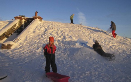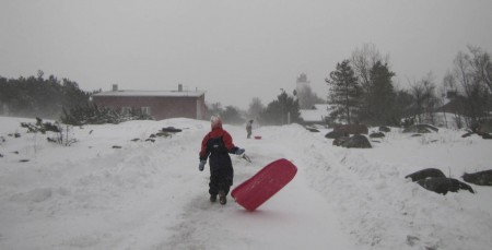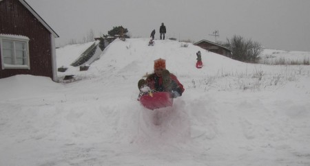Kauppa on auki taas monen päivän jälkeen. Pulkalla on hyvä kuljettaa ostoksia. Lähdemme etsimään, mistä löytyvät saaren parhaat pulkkamäet. Kaupan viereinen rinne ei ole tällä kelillä hyvä. Iida laski kerran ja hävisi laiturille rantavajojen sekaan. Jalkapallokentän itäpuolen kumpare, Karvamäki, osoittautuu hyväksi, vaikka puolessa välissä on hidasteena hyppyri ja vauhtia riittää tien yli. Pojan pulkka halkeaa laskuissa, mutta korjaamme sen roudarinteipillä.
