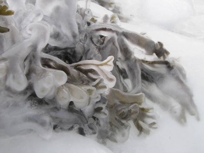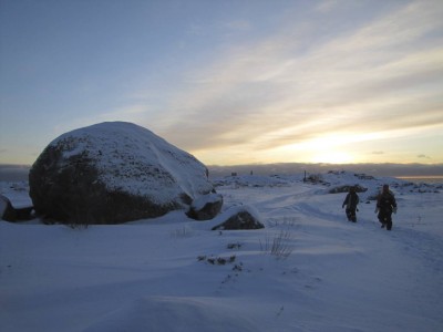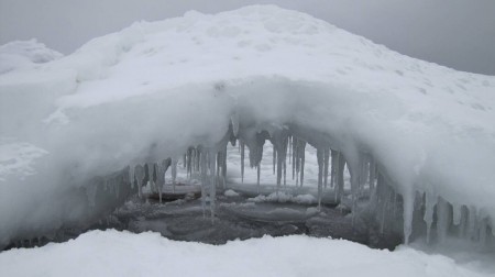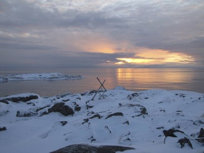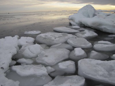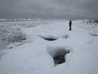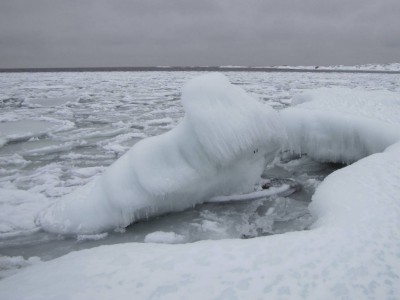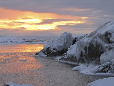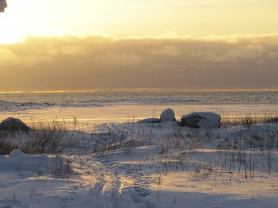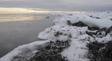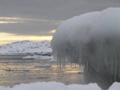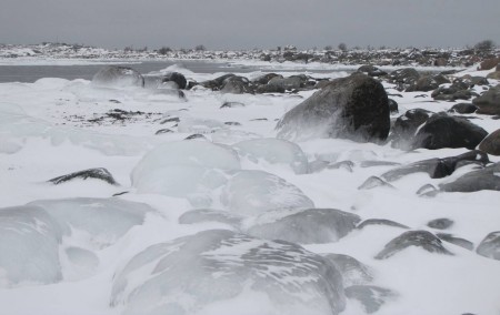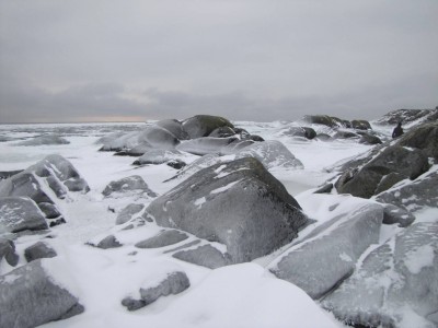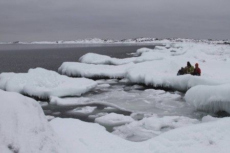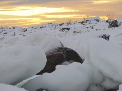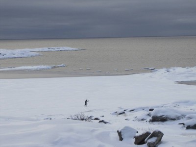 Teemme Juhan kanssa monen tunnin retken rantoja pitkin itärannasta eteläkärkeen. Rannan peittää vesirajassa yhtenäinen jäävyöhyke, jonka päällä voi kävellä, jos varoo aukkoja ja sulakohtia. Rannan kiviä peittää jäinen kuorrutus, rantaan ajautuneet rakkolevät ovat jääkuoren sisällä. Jäälautoista ja rannan jäästä roikkuu jääpuikkoja, monin paikoin jää on hienon turkoosia. Joissain kohdin se on kohonnut harjanteiksi, tai muodostaa onkaloita. On huippukaunista. Puolivälissä matkaa rannalta löytyy kuollut hylje. Se haisee hämmästyttävästi, vaikka pakkasta on paljon. Kävelyretki jatkuu eteläkärkeen asti. Kun yritän nousta jyrkkää kallioseinämää, pääsen toteamaan sen, että merestä on lähes mahdotonta päästä ylös, kun rannan kalliot ovat jään peitossa.