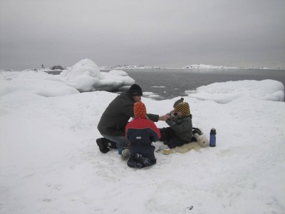 Lapset ovat tänään ulkona aamusta iltaan, paitsi nuorin, jolla on edelleen vähän käheä ääni. Teemme lasten ja lasten kaverin kanssa yhteisen piknikreissun itärantaan. On kylmää, mutta hauskaa. Eväät ja hunajatee katoavat hetkessä. Lapset keksivät myös haistella koloja – haisee levältä-, ja maistella jääpuikkoja – yäk, maistuu levältä. Kuuntelemme, miten vesi alamme litisee, lorisee ja pulppuaa.