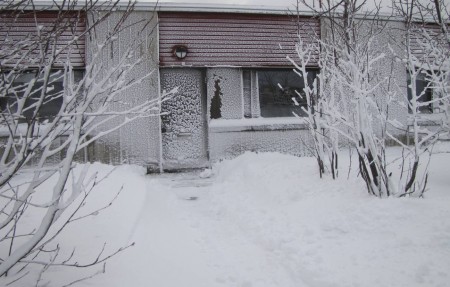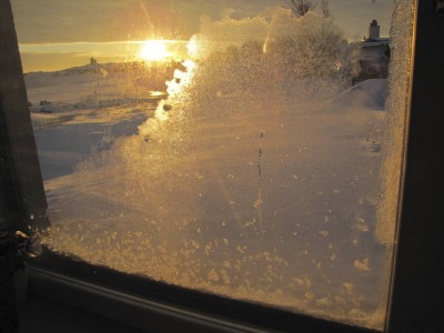 Kuuntelen yöllä myrskyä. Aamulla koko kylä on jääkuuran peitossa. Monet talot näyttävät vähän piparkakkutaloilta sokerikuorrutuksessa. Hotelliasuntomme ovikin on hämmästyttävästi lumikiteiden peitossa. Jää on eteläpuolen lahdelta kadonnut. Meri pauhaa vapaana Jannen hiihtolatujen kohdalla. Illalla käymme hotellilla kuuntelemassa bändiä.