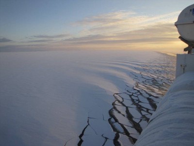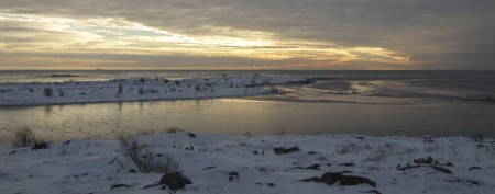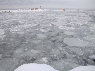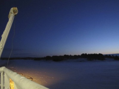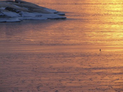 Käymme aamulla vielä lyhyellä retkellä, sitten pakkailemme loppuun. Eivor lähtee yhdeltä. Laivamatkan alku on aurinkoinen (nyt se aurinko sitten näyttäytyy)! Katselemme kannella, miten Utön saari häviää vähitellen näkyvistä. Aika pian vastassa on yhtenäinen jääkenttä. Jää on pitkän matkaa niin ohutta, että se aaltoilee jännästi laivan murtaessa sitä. Näemme useampia kyhmyjoutsenia jääkenttien keskellä. Yksi perhe näyttää jo kuukahtaneen keskelle jäätä.