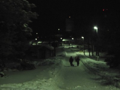 Alkuillasta laskemme pulkilla kirjaston viereistä rinnettä, joka on hyvin aurattu. Ilta on hämmästyttävän lämmin ja tyyni. Näemme huuhkajan hämärissä Ormskärillä. Käymme illalla koululla pullakahvilla ja leikkimässä. Pojat mittailevat toisiaan pitkällä viivottimella. Toinen on vähän yli ja toinen vähän alle metrin.
