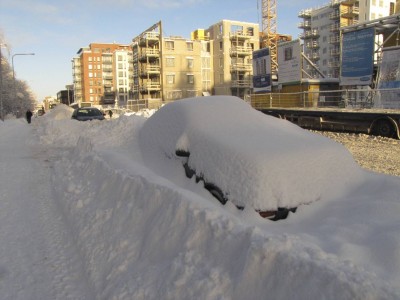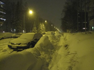 Helsingin lumimäärä on hämmästyttävä. Kadun reunojen kinokset ovat niin korkeat, että aina ei sisään jääneitä autoja edes huomaa. Kotipihan reunaan aurattu lumikasa on niin korkea, että ylettyy jo pyöräkatoksen reunaan. Kohta voisimme laskea ikkunoista pyllymäkeä ulos, jos vielä vähän virittäisi kasaa. Ruokinnalla käy yksinäisen peipon lisäksi tiaisia, varpusia, ja viherpeippoja. Koirasmustarastas piilottelee talomme saunan terassin alla.