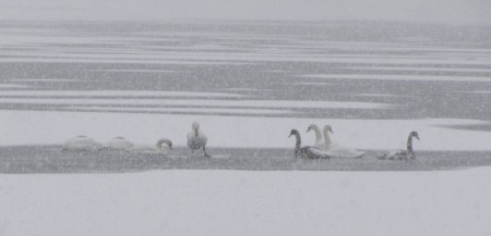 Kyhmärit ovat pyörineet sulassa uimarannan edustalla. Vähitellen alkaa meri jäätyä ja uimatila vähentyä. Viime talven tarinat Utön kyhmyjoutsenten kohtaloista tulevat mieleen.