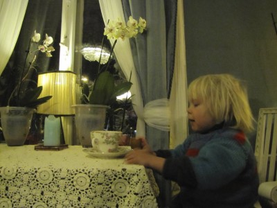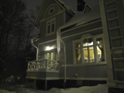 Kävin nuorimman kanssa Seurasaaren tonttupolulla. Muistelin, miten sadunomaiselta viime vuonna näytti luminen jouluvalaistu metsä. Tällä kertaa suorituksemme ei ollut mikään varsinainen menestys. Vaatteita oli niin paljon päällä, että kolmevuotias sojotti rattaissa tönkkönä pökkelönä, jota kuskasin pitkin saarta. Juuri kun pääsin ajattelemasta, että ainakaan ei kylmä yllätä, alkoi poika huutaa että varpaisiin sattuu, kylmä. Siis vaikka oli sukkahousut, kahdet villasukat ja huopatöppöset! No, sitten tuli kiire pois, ja lopulta pelastauduimme hienoon kahvilaan sillan kupeeseen. Joimme tosihienoista kupeista kaakaot.