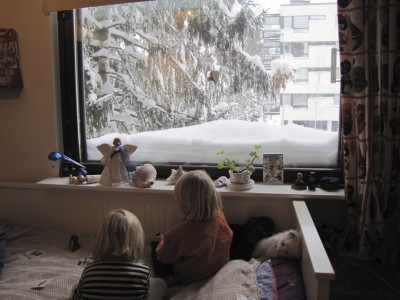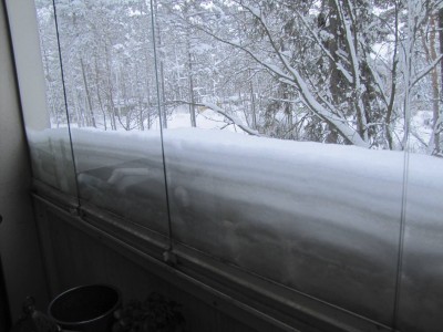Lunta satoi koko päivän – hämmästyttävää. Tulee mieleen Andrei Makinen kirja Venäläisiä unelmia, josta tykkäsin aikanaan tosi paljon. Muistaakseni kirjan alussa kaivaudutaan talosta ulos. Meilläkin lumi peittää jo suuren osan näkymästä.