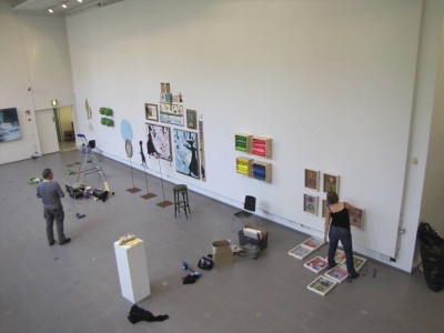 Ryhmänäyttelyn ripustaminen on parhaimmillaan aika hauskaa! Aluksi kaikki kaivavat teoksensa esiin kuljetuspaketeista, ja sitten aletaan miettiä miten ne sopivat vierekkäin. Töitä pyöritetään tilassa eri seinille, ja vähitellen ne tuntuvat loksahtavan paikoilleen. Päälinjojen hahmotuttua taiteilijat alkavat virittää teoksia seinille. Vatupassit, mittanauhat, narunpätkät ja laudat auttavat etäisyyksien mittaamisessa, välillä pitää peruuttaa kauemmas katsomaan. Sain avarelleilleni korkean päätyseinän ja pääsin keikkumaan melkein katonrajaan henkilönostimen avulla. Konetta oli reteetä käyttää!