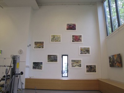 Avajaisaamuna sain soiton Kanneltalosta, että akvarellini olivat varisseet maahan kuin syksyn lehdet. Jouduin säntäämään paikalle hyvissä ajoin ennen avajaisten alkua, ja kikkailemaan teokset seinälle uudelleen henkilönosturin kanssa. Ripustamisen vaikeus on siinä, että seinälle ei saa naulata. Laitoin uudet teipit, ja lisäsin niiden määrää, ja kuvittelen, että nyt pysyvät kun en enää siirtele töitä.