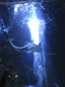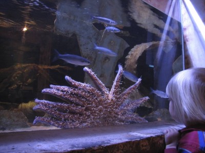 Kolmevuotiasta on alkanut harmittaa kerhoon meno, ja perjantaina päätimme että poika voi huilata välillä. Lähdin pojan suosikkipaikkaan merimaailmaan, ja vietimme siellä hauskan aamupäivän ihmetellen taas kerran miten kummallisen värisiä ja näköisiä kaloja maailmassa on. Näimme uuden tulokkaan meritähden vaeltavan akvaariolasin pintaa pitkin, seurasimme ampujakalojen ruokailua, kuuntelimme kalojen ääniä. Osallistuimme myös merirosvoaarteen etsintään.