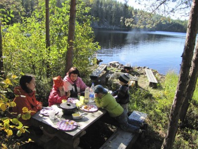 Vietimme syyskuun viimeistä viikonloppua Mäntyharjulla. Kelit olivat lähes loppukesäiset, koska osa meistä oli pitkin päivää teepaidoissa, joku ilman paitaakin. Grillattiin, savustettiin ja syötiin rannassa.