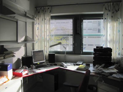 Vietin ensimmäisen työpäivän pyörien työhuoneessani, tapasin tuttuja, hankin nimikyltin oveen, purin pahvilaatikoista tavaroita, välillä kävin kahvilla ja tuijottelin poliisitalon seinään. Kyllä tämä tästä taas alkaa. Sähköpostissa oli 11 495 lukematonta sähköpostia.