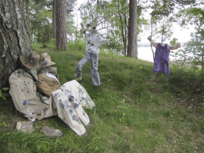 Sain eilen illalla myöhään soiton Kivinokasta, että teokseni on revitty irti, ja löytyi mereen paiskattuna. Olen osallistunut Kivinokkaan jo seitsemän kertaa aikaisemmin, eikä töitäni ole koskaan rikottu millään lailla. En ole ennen tehnyt mitään ihmishahmoista. Jäin miettimään, ärsyttivätkö hahmot juuri jotain porukkaa.