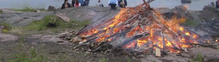 Illalla kävelimme Ryssänkärkeen kokolle. Juhannusruusut kukkivat ja koiranputket hehkuivat valkoisina kesäyössä. Meri oli tyyni. Kokko oli kerännyt rantaan pari sataa juhannuksen juhlijaa, mutta meno oli hyvin rauhallista. Saavuimme paikalle vähän kahdeksan jälkeen kun kokko oli juuri sytytetty ja viivyimme tunnin verran. Vastarannalla Pihlajasaaressa paloi toinen kokko, ja merellä kulki useita laivoja, vanhoja purjeveneitä, turistivesibusseja, pikkuveneitä. Katselin hetken aikaa keskimmäisen kanssa kokkoa. Niskaani lensi kuoharipullonkorkki. Sain iloiselta seurueelta korvaukseksi kopsahduksesta lasillisen.