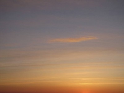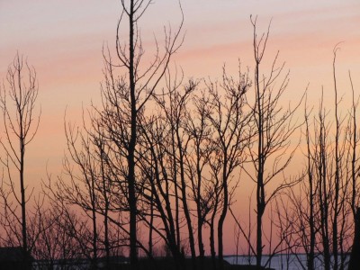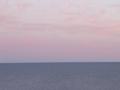 Näimme hienosti, miten lähisaarten kallioiden muodot tulivat esiin ilta-auringossa, varjot pitenivät auringon laskiessa, valo punertui. Tiirojen siivet välkehtivät auringossa. Horisonttiviiva näytti hämmästyttävän suoralta: taiteilijalla on ollut vakaa käsi. Kun aurinko laski, taivaanranta värjäytyi oranssiksi, yläpuoliset muutamat pilvet keltaisiksi, ja etelän puoleiset pilvet vaaleanpunaisiksi. Juha olisi halunnut nähdä ihan punaisen ilta-auringon, jossa taivas lyö teräsbetonin voimalla tulta.