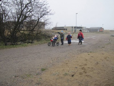 Äitienpäivä oli kostea ja sumuinen. Vesipisarat kimaltelivat helminä heinissä, oksissa ja pihan narsisseissa. Hieno ilma jäkäläretkelle. Lapset tekivät hiekkatiellä lätäköistä pikkupuroja.