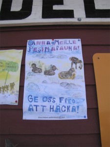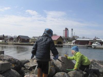 Keräilimme päivällä simpukankuoria rannasta, ja tutkimme rakkolevää. Etsiskelimme myös mitä muuta aallot ovat tuoneet. Usein rantaan ajautuu jostain syystä kenkiä. Ovatkohan ne veneilijöiden jalasta lipsahtaneita, vai jonkun uimarin, joka on jättänyt kengät liian lähelle rantaa aaltojen ulottuville. Ehkä aallot kuljettavat erityisen hyvin kenkiä. Viime syksynä pääsimme veneretkelle Sandöra- saarelle, ja sieltä löytyi myös useita kenkiä, mutta lisäksi esimerkiksi ehjä hehkulamppu.