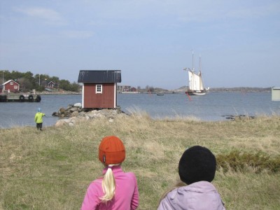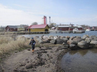 Iida viritteli jonkin verran leikkejä saaressa olevien tyttöjen kanssa, mutta oli vähän kolmantena pyöränä, kun tytöt olivat ennestään tutut toisilleen. Jopsu oli myös pienen välimatkan päässä leikistä tarkkailuasemissa jonkinlaisena neljäntenä pyöränä tai ulkojäsenenä. Vein lapsille lopulta kenttälounaan ulos, kun en raaskinut patistaa sisään. Iltaviideltä kävimme majakkakaupassa ostamassa veljelleni majakkajulisteen. Mantereella on rikottu tänään jo hellelukemia, mutta täällä on kuitenkin vielä pidetty pipoja päässä kun tuulee. Vakioulkovarustukseni koko melkein kahden kuukauden ajan on ollut sama: keltaiset kumpparit, oranssi takki, punainen pipo, hanskat, kännykkä taskuun, ja kiikari ja kamera kaulaan.